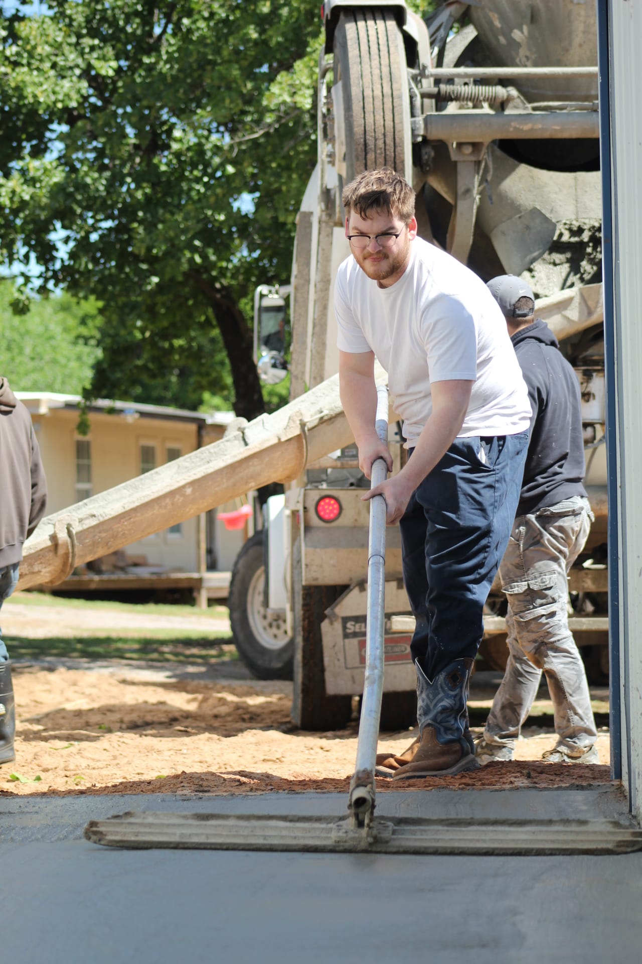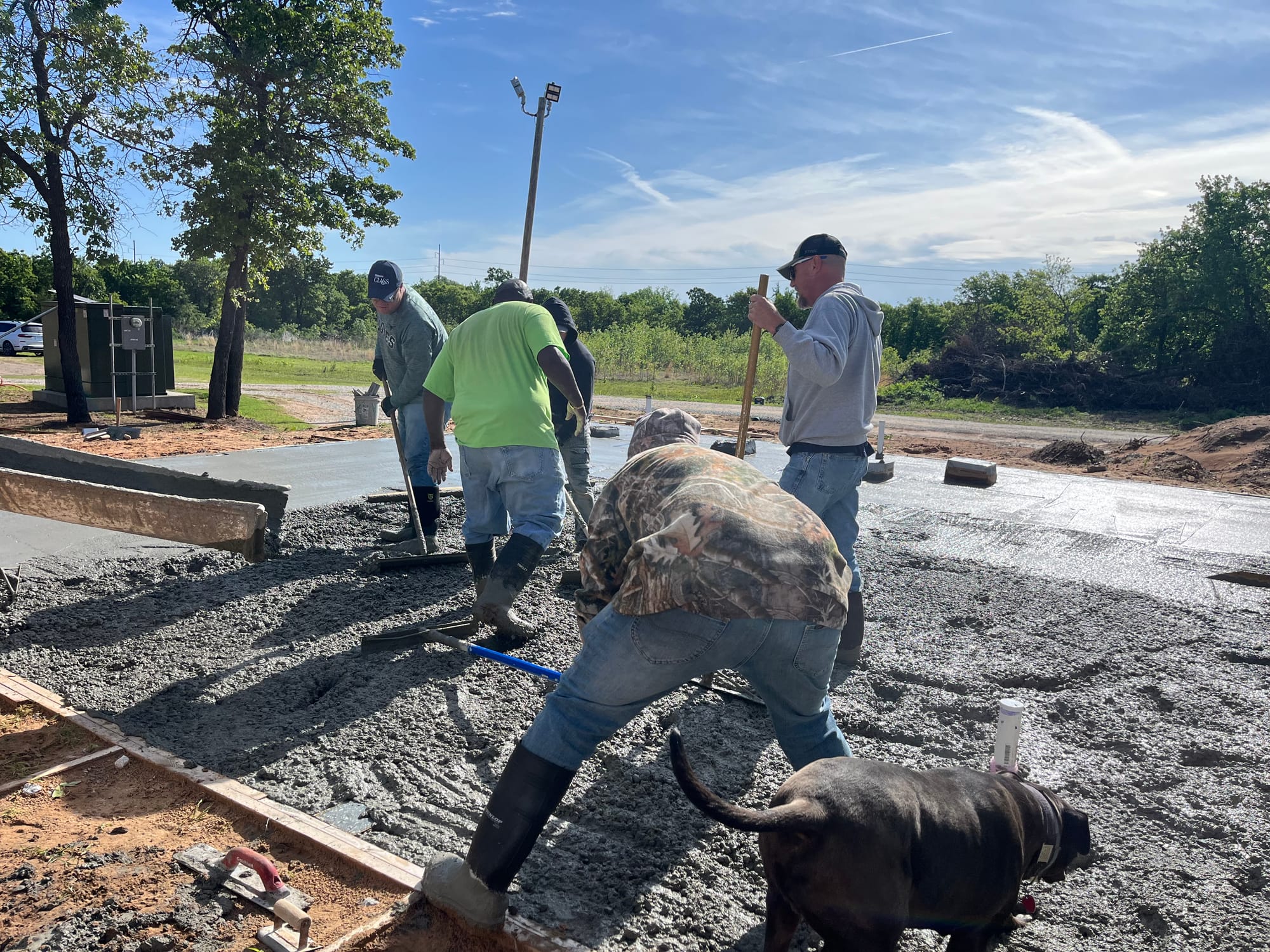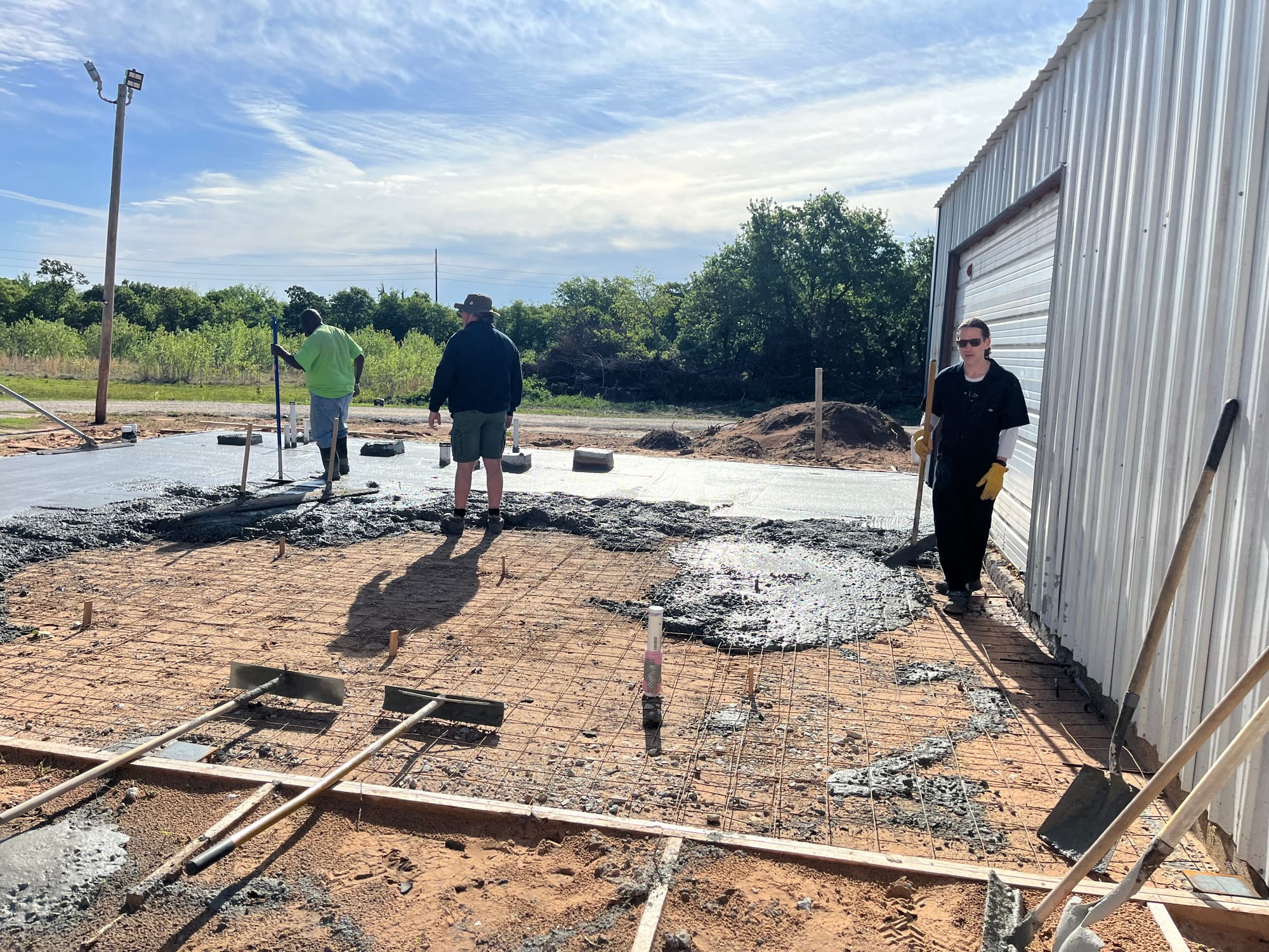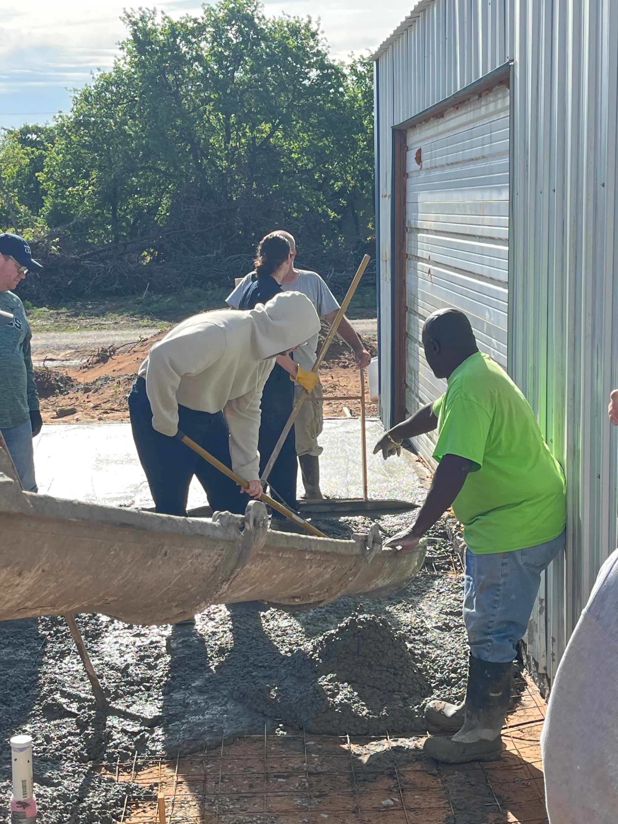 On a stretch of land at 11889 Albright, where law enforcement once shut down an illegal marijuana grow operation, a different kind of work is now underway. On Saturday, volunteers gathered at Living Waters Church to pour a concrete slab that will expand the church’s current meeting space, marking a visible step forward in a broader effort to transform the five-acre property. Roughly 20 people showed up to help with the project, assisting with everything from pouring and smoothing concrete to preparing food and providing childcare for workers, while a concrete expert, Steve Pollard, from Immanuel Baptist in Shawnee helped guide the pour. For church leaders, the day represented more than construction progress.
